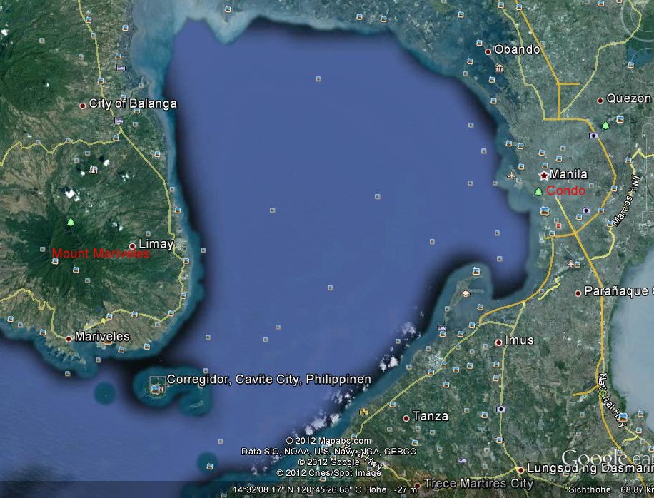 Since I bought a car in Cebu, a Kia Sorento SUV in like-new-condition with only 30.000km we had to ferry it when we decided to return to Manila, where Grace lived, and so we did. I liked the good life in the better hotels a lot, now we rented a small but nice condo high in Alpha Grandview Tower (in the meantime I learned that Google earth knows the building: just enter "Alpha G" into the search and You have it, there's only one in the world!). In the middle of the bay, in the middle of Manila, great location, American Embassy is only 300m away. Grand views over Manila and the bay, as the name says! Alpha Grandview
